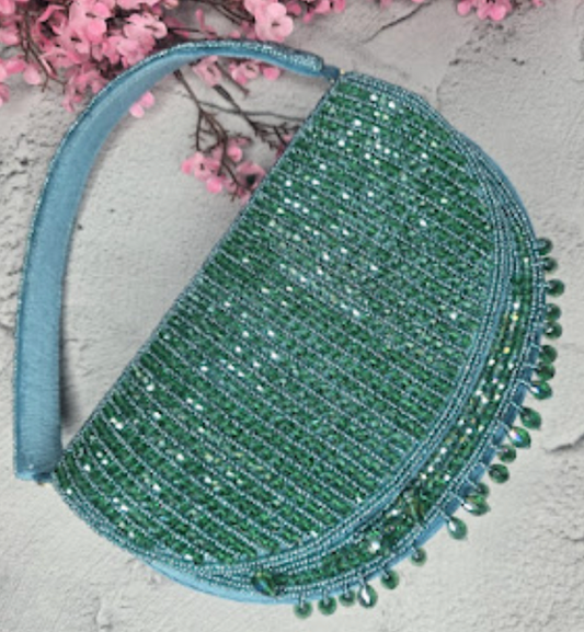 Beaded Handbag in Aqua Green Underarm With Tassles