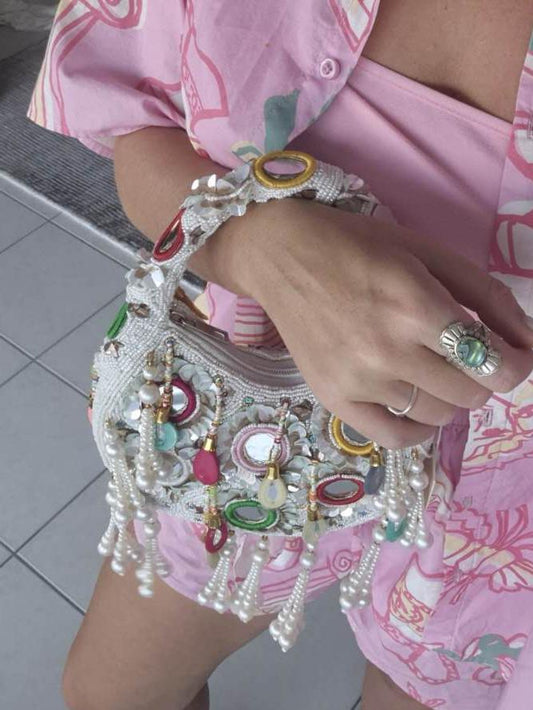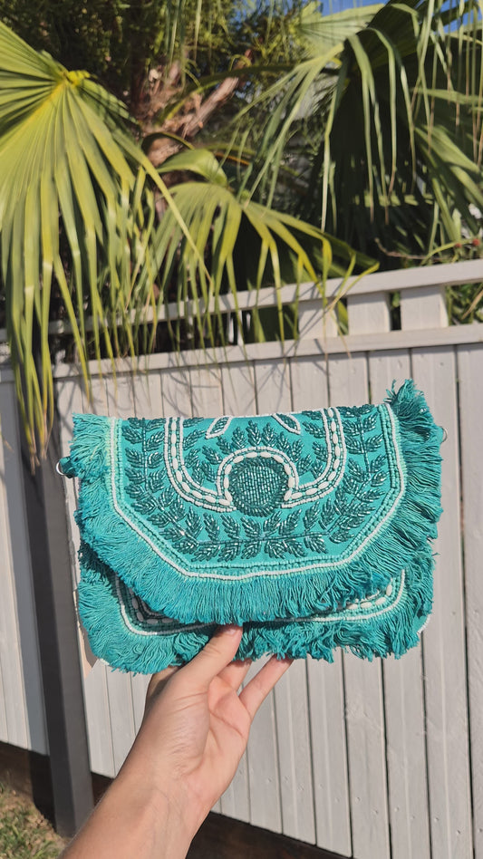 Handbag Beaded Embellished Tassle Clutch Aqua