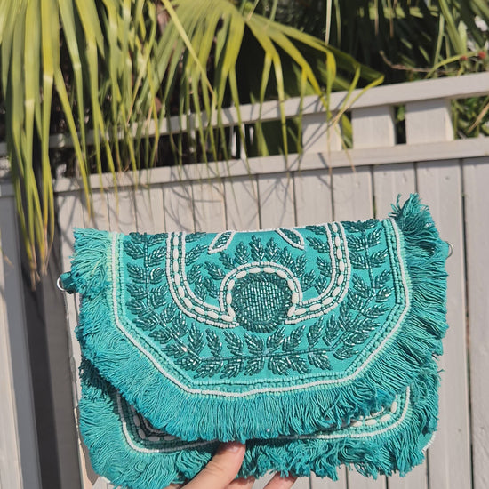 Handbag Beaded Embellished Tassle Clutch Aqua