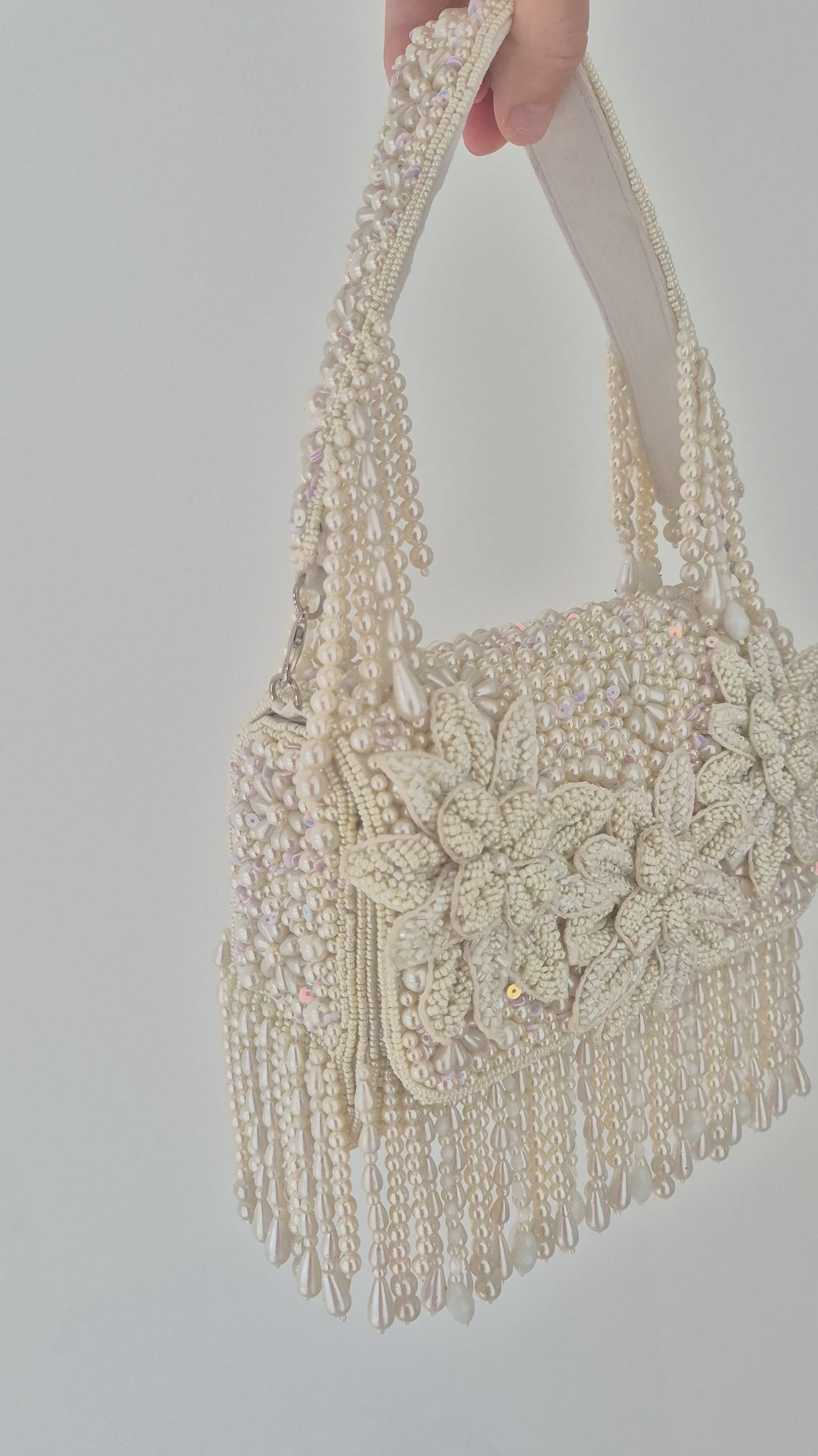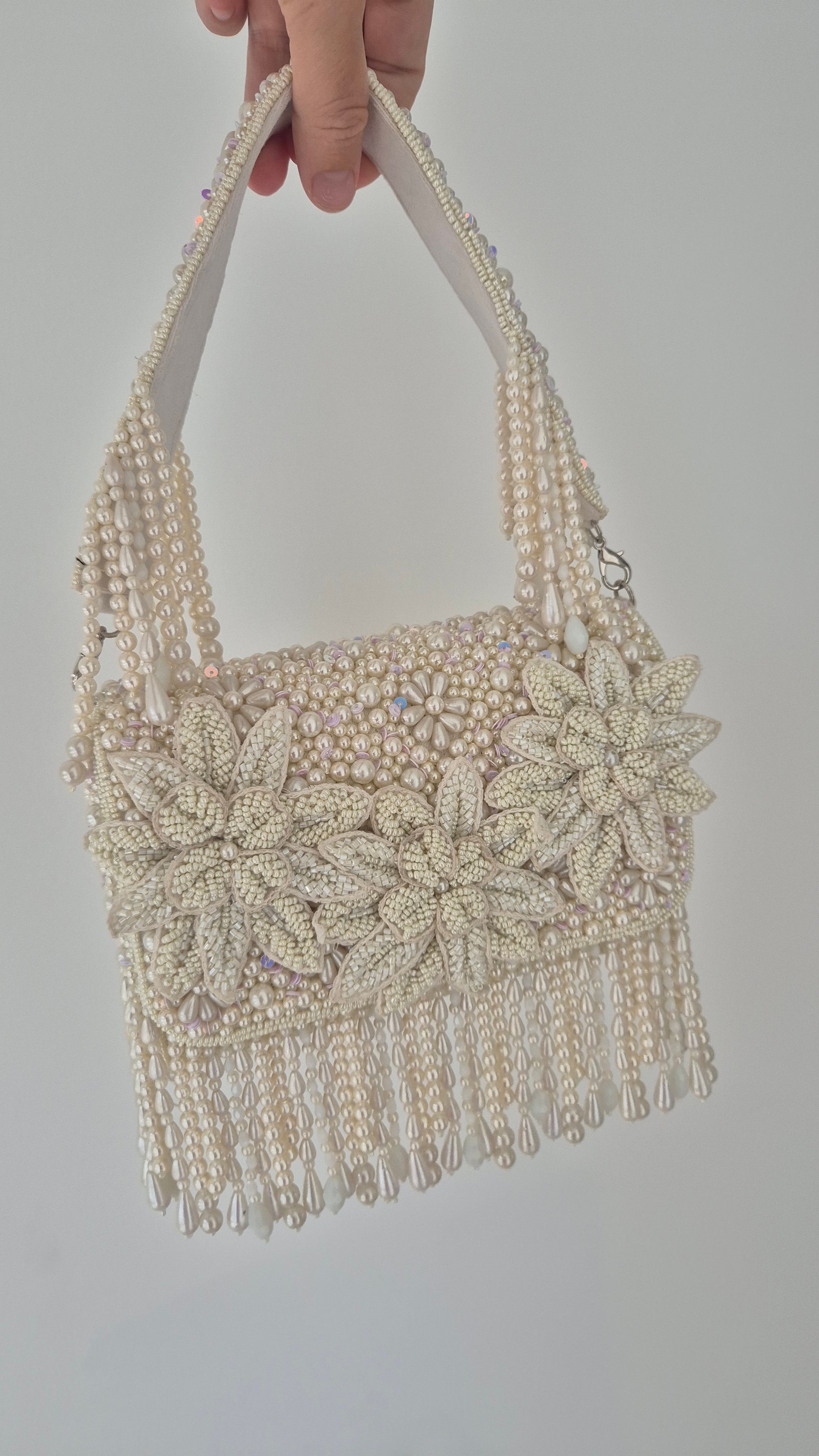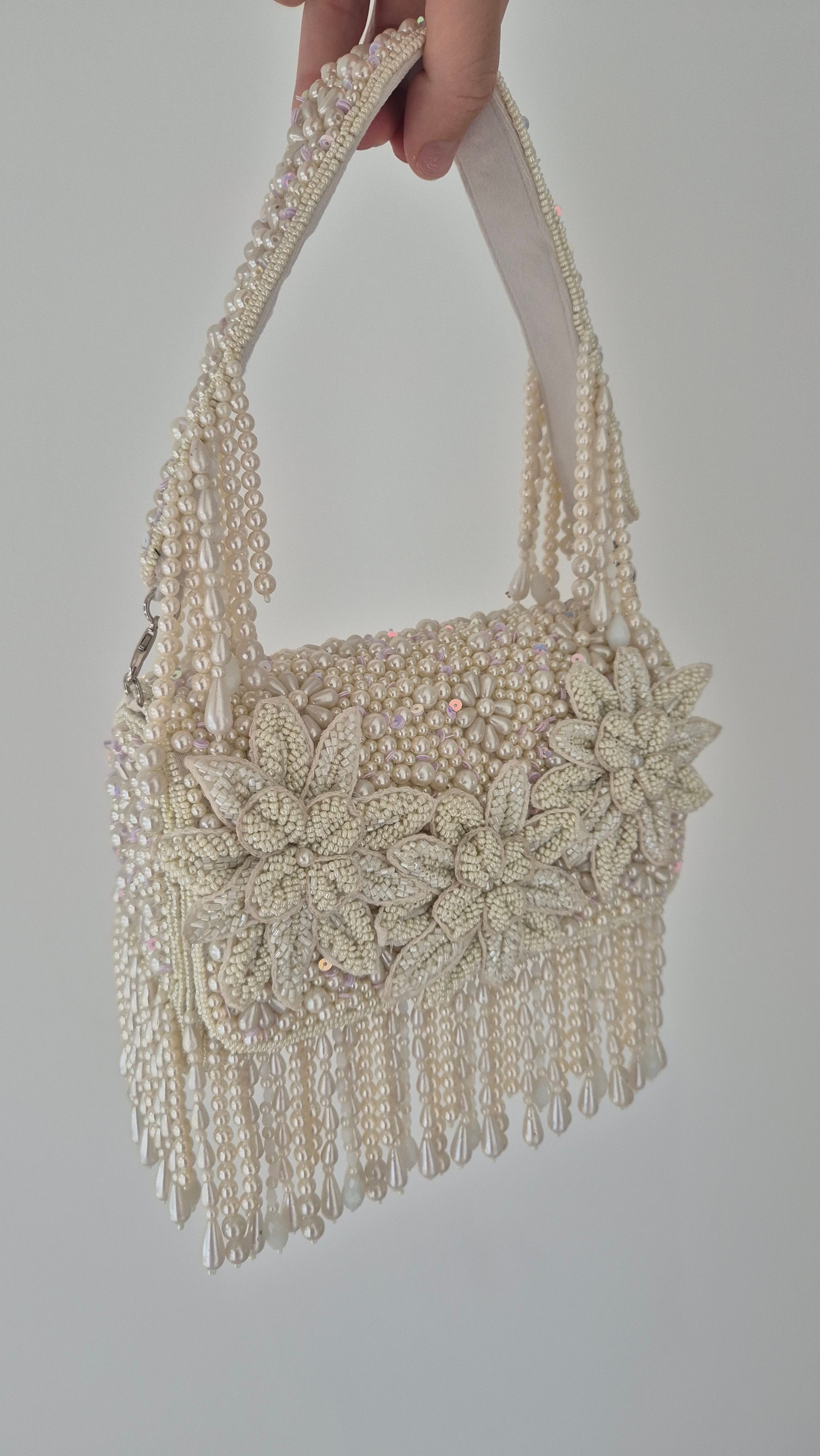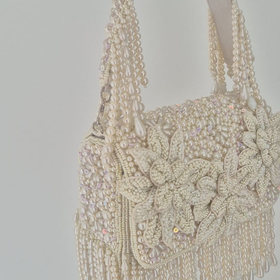 White pearl flower heavily beaded embellished handbag with tassels.