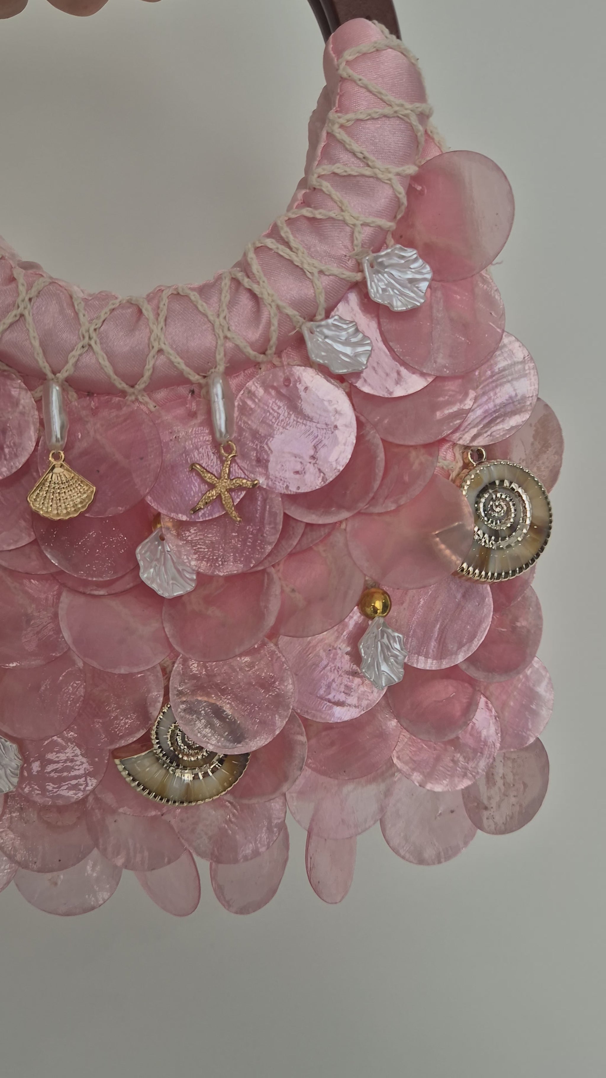 Shell satin bag with wooden hoop handle.